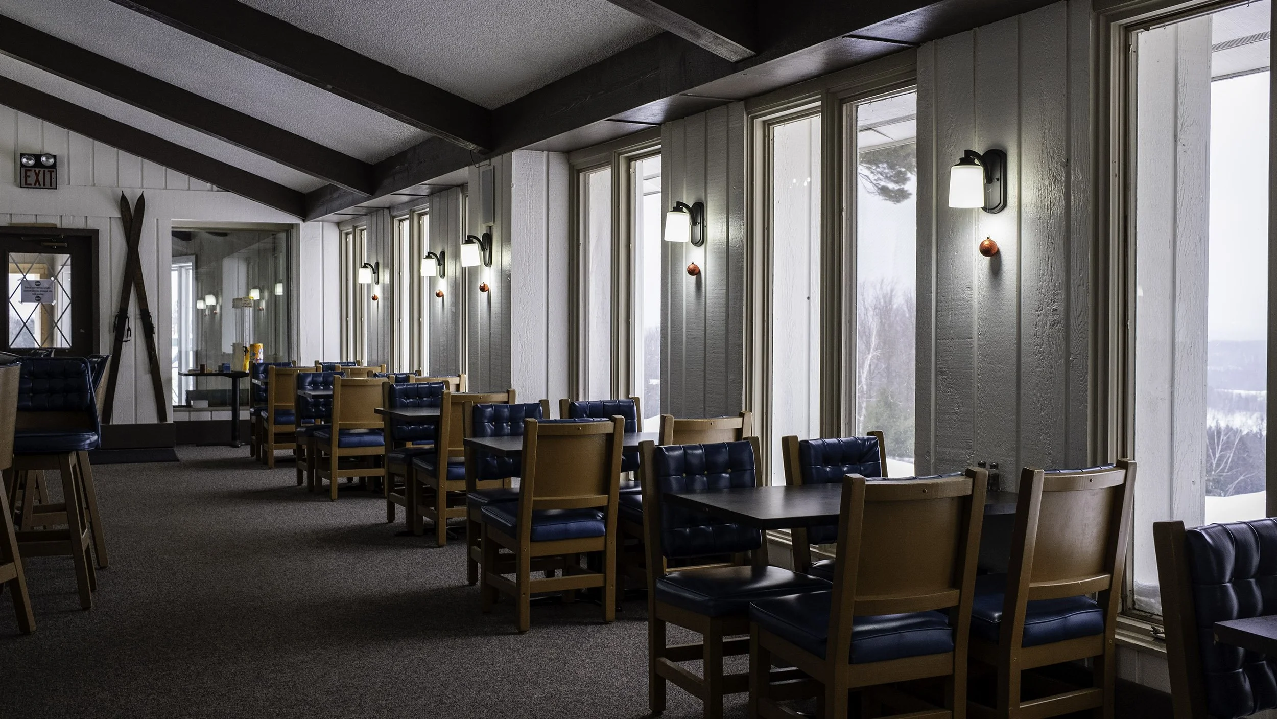 After a full day of skiing or snowboarding, skiers can unwind and socialize at the Moosehead Restaurant. With its rustic lodge atmosphere and panoramic views of the ski hill, it's the perfect spot to relax. The menu features a variety of comfort food options, including appetizers, classic sandwiches, pasta dishes, and fish entrées, along with a full bar.